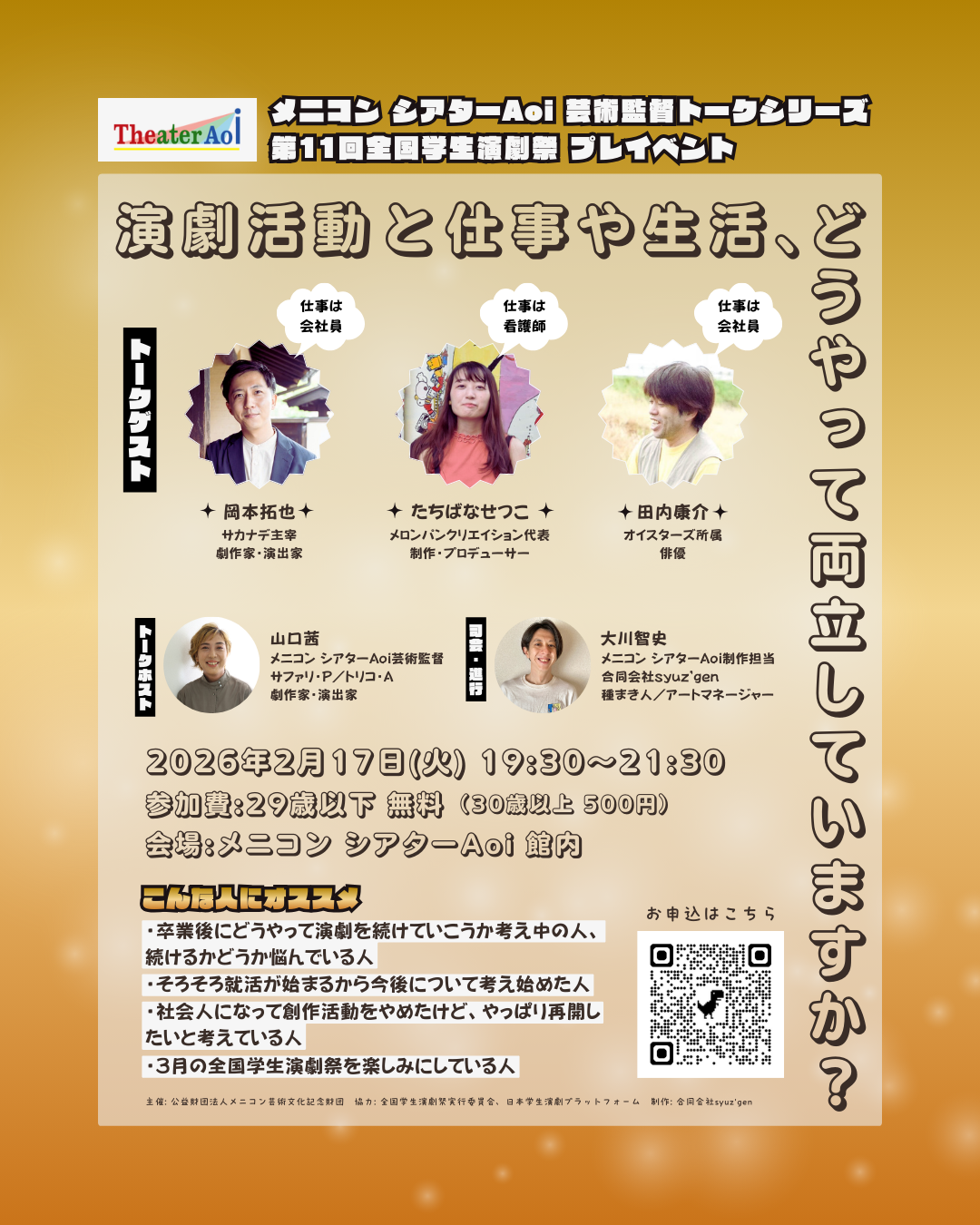 かたや、トークホストと司会を務めるメニコン シアターAoiの二人は舞台の仕事がメインです。それぞれの違いなども聞きながら、これからのご自身の創作活動との向き合い方を考える機会としていただけますと幸いです。